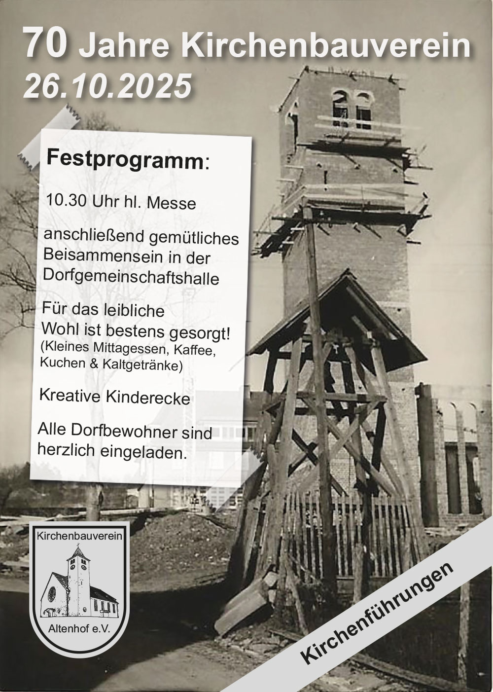 Der Kirchenbauverein Altenhof feiert am Sonntag 26.10.25 sein 70jähriges Bestehen.