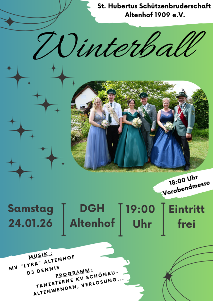 Am Samstag, 24. Januar, steht in Altenhof ein Höhepunkt des Schützenjahres bevor: der traditionelle Winterball der Schützenbruderschaft Altenhof. Eingeladen sind alle Schützen, Jungschützen sowie die Bewohner aus Altenhof, Girkhausen und der Umgebung. Der Eintritt ist frei.